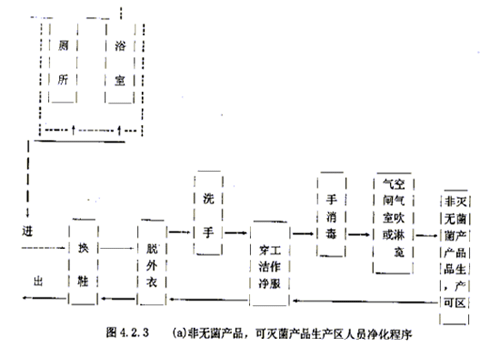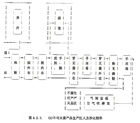 ??第4.2.3條 人員凈化用室和生活用室的布置應避免往復交叉。一般按下列程序(圖4.2.3)進行布置:(圖見后)